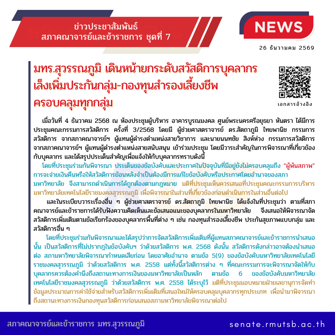 มทร.สุวรรณภูมิ เดินหน้ายกระดับสวัสดิการบุคลากร เล็งเพิ่มประกันกลุ่ม-กองทุนสำรองเลี้ยงชีพ ครอบคลุมทุกกลุ่ม